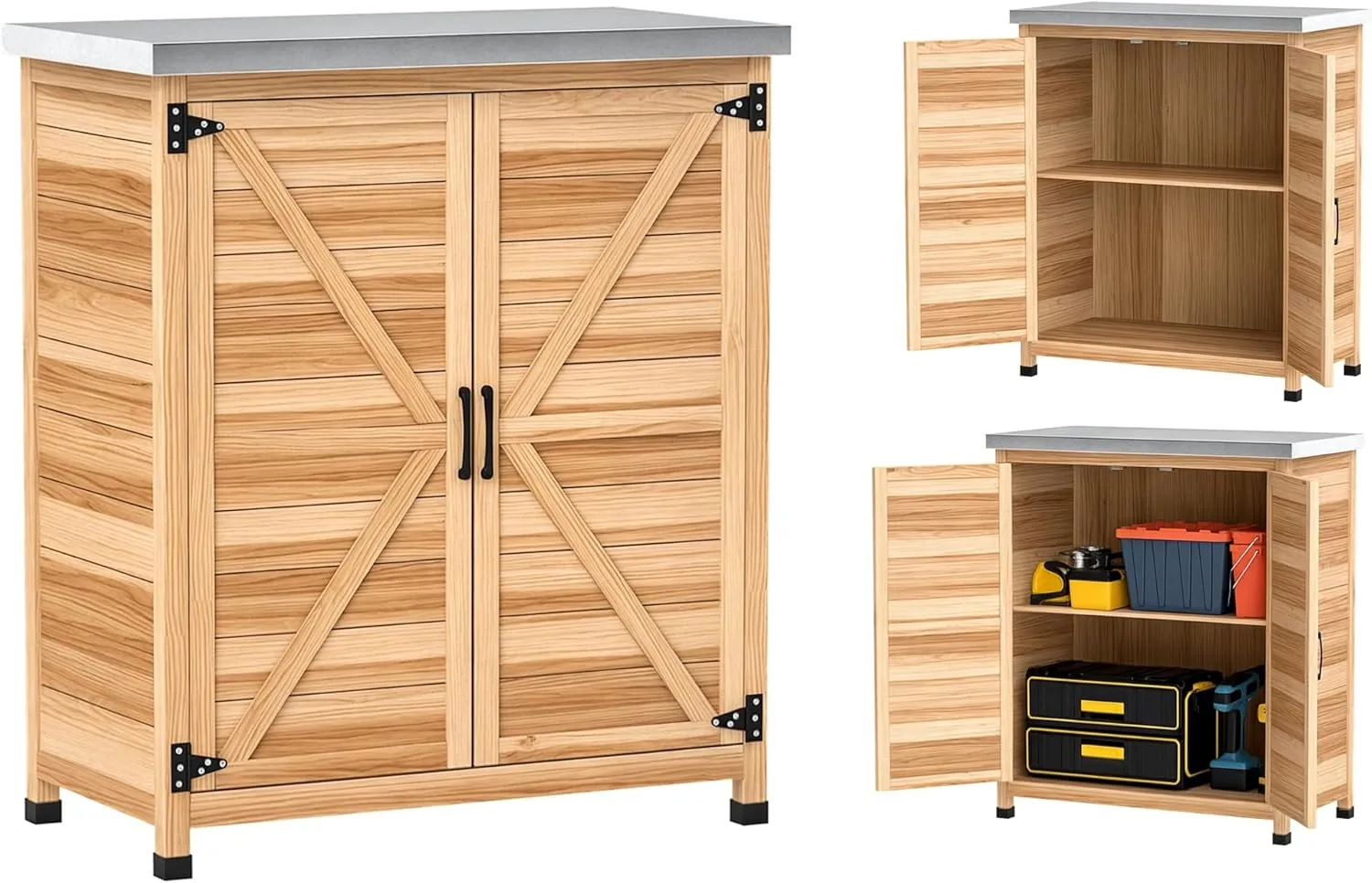 Armadio da Giardino in Abete con Banco di Lavoro in Acciaio, 79x43x92cm