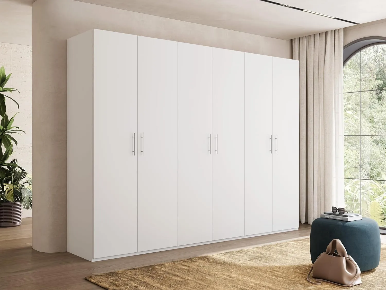 Armadio a 6 ante in bianco opaco. Include ripiano e appendiabiti. Ogni porta ha una larghezza di 45 cm. Prodotto in Italia.