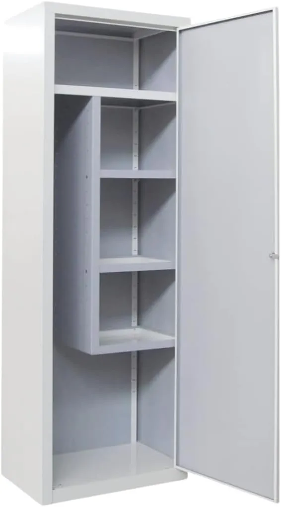 Realizzato in lamiera preverniciata bianco-grigio, offre durabilità e resistenza alla corrosione. Progettato con uno scomparto verticale per scope e attrezzi lunghi, e quattro ripiani laterali per detergenti e accessori. Fornito smontato con istruzioni per un montaggio semplice. Dotato di serratura a chiave per proteggere i prodotti. Adatto per ambienti domestici, uffici, magazzini e locali di servizio.