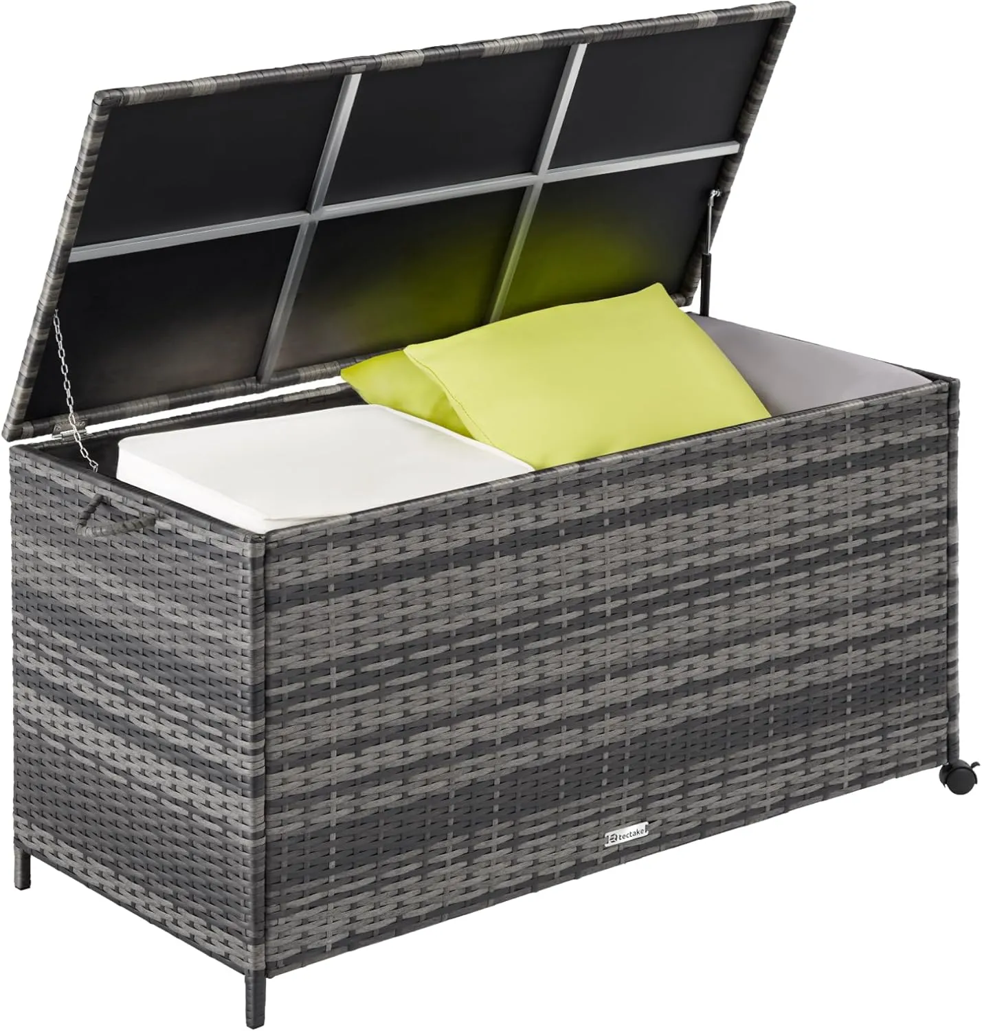 Il baule contenitore offre una grande capacità per organizzare spazi come giardino, balcone o terrazzo. Realizzato in polyrattan resistente ai raggi UV e telaio in alluminio, è adatto sia per esterni che per interni. Il coperchio è rinforzato con sistema a molla a gas per un'apertura semplice. Dotato di rotelle girevoli e piedi con cappucci in plastica, facilita il trasporto. Montaggio rapido e manutenzione semplice grazie alla superficie facile da pulire.