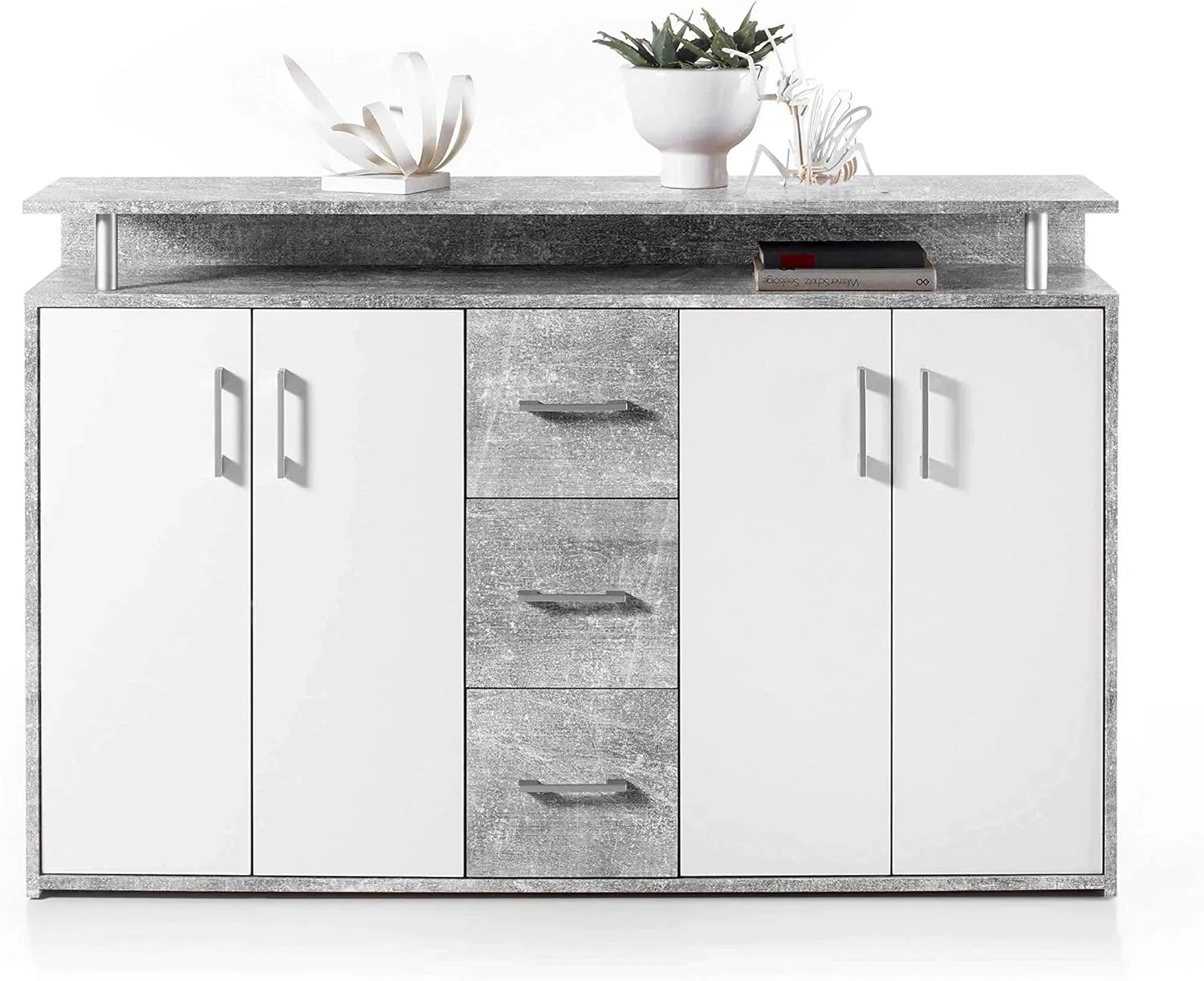 Comò moderno con 4 ante a battente, 3 cassetti e un ripiano superiore. All'interno si trova 1 ripiano dietro le ante doppie per lato, offrendo spazio per abbigliamento o altri oggetti. Dispone anche di 1 ripiano aperto per giornali o libri e spazio sul piano superiore. È adatto per ingresso, soggiorno o camera da letto.