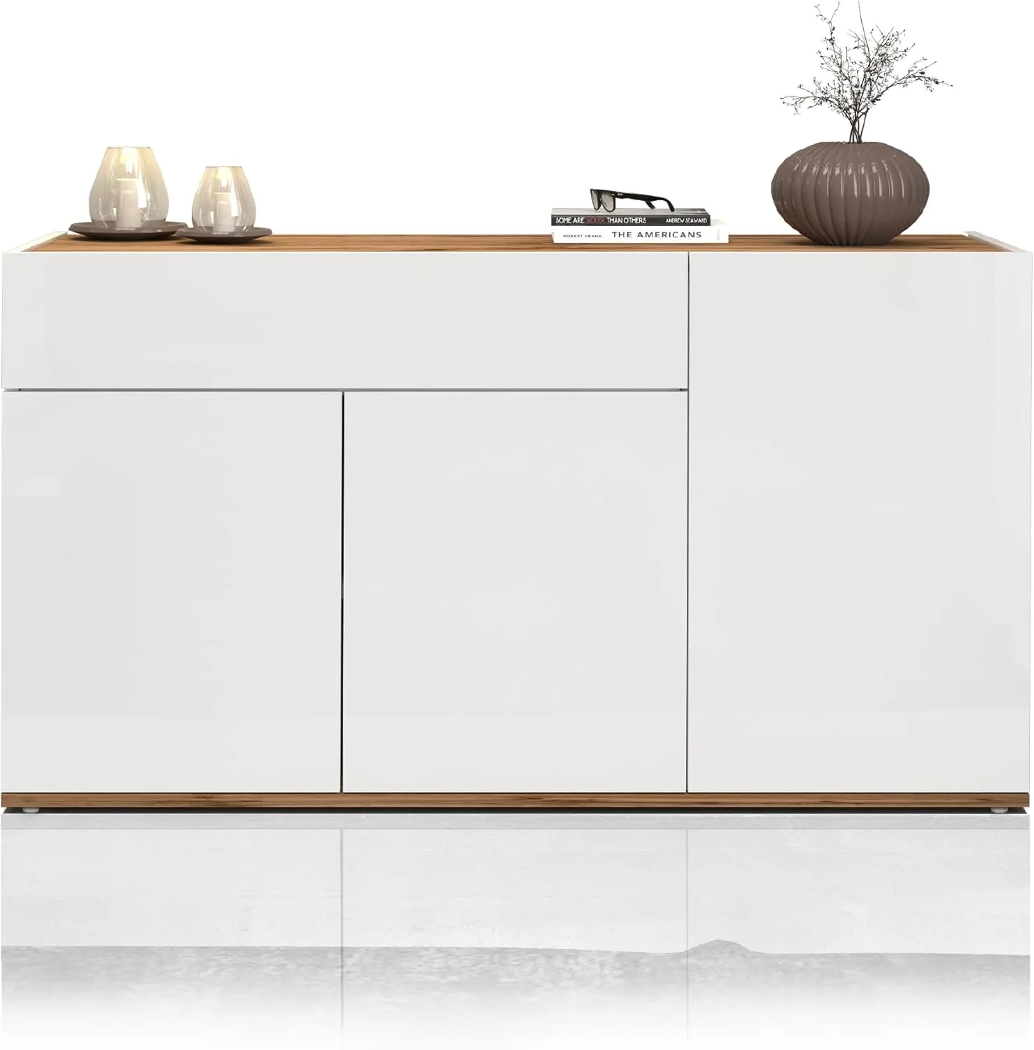 Credenza in Legno con 1 Cassetto e 3 Ante, Buffet per Soggiorno e Sala da Pranzo, Bianco Lucido e Rovere, 120x35x70 cm