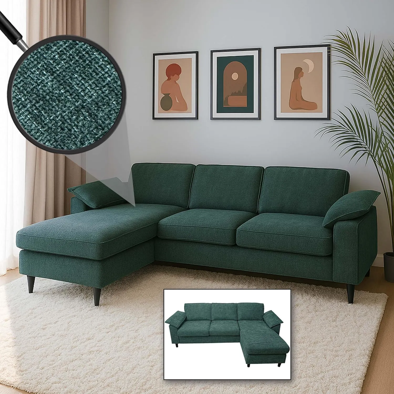 Divano componibile a forma di L che offre una superficie di seduta, montabile a destra o a sinistra. Dotato di molle insacchettate sotto la superficie di appoggio e nei cuscini della seduta. Tessuto (320 g/m²) con imbottitura in 3 strati di schiuma. Include 3 cuscini dello schienale con coperture sfoderabili e braccioli rimovibili con chiusura in velcro. Carico massimo di 150 kg per posto a sedere. Struttura in legno di pioppo e gambe in plastica.