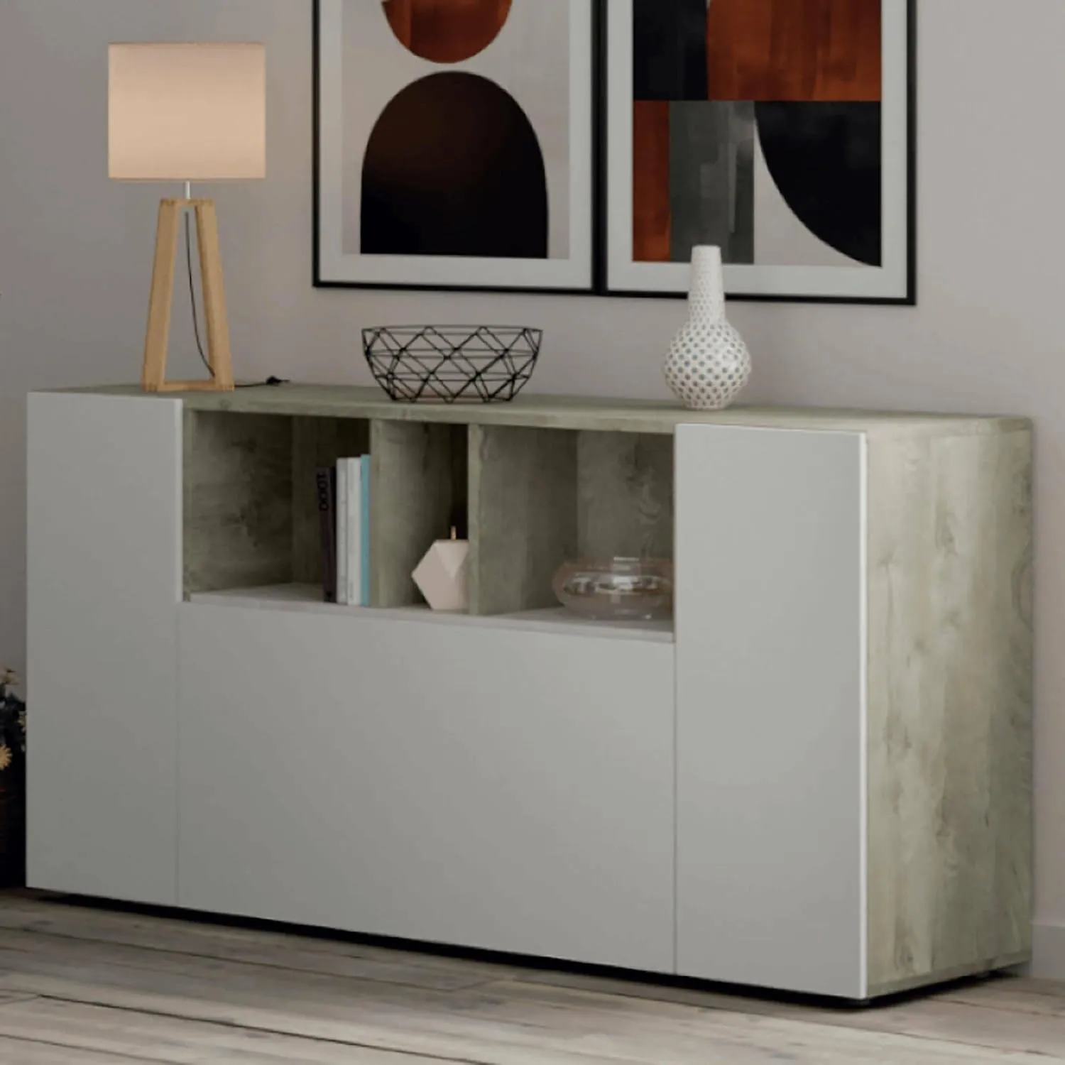 Madia da salotto versatile con scomparti e spazio per TV. Dotata di due ante battenti, un'anta a ribalta e tre scaffali a vista, con due ripiani interni regolabili. Le ante sono senza maniglie per un design pulito. Adatto per sala da pranzo, soggiorno, corridoio, ingresso o ufficio, offre spazio ordinato per stoviglie, bicchieri, tovaglie, posate, libri, documenti o oggetti decorativi. Prodotto in legno laminato da 15 mm, resistente agli urti e ai graffi, impermeabile e duraturo. Rifinitura in melaminico, schienale in MDF bianco, cerniere in metallo e piedini in ABS nascosti. Dimensioni: 150x41x76 cm.