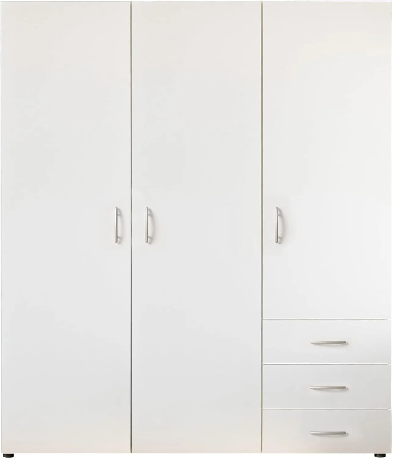 ARMADIO FUNZIONALE: Armadio con ripiani e aste, adatto per organizzare i tuoi abiti. Questo armadio bianco opaco arricchisce la tua camera da letto. Misure complete ca. LAP 150,2x176,2x51,3cm. CON DESIGN MODERNO: Dispone di 3 ante a battente e 3 cassetti, utile anche in spazi ridotti. La sua struttura lineare lo rende facile da abbinare a vari arredamenti. MATERIALE DUREVOLE: Realizzato in legno truciolare rivestito in melamina di colore bianco opaco, stabile e adattabile a diversi stili. Consigli per il trattamento: evitare detergenti abrasivi. ISTRUZIONI DI MONTAGGIO: Le parti sono illustrate nelle istruzioni per un montaggio facile. ARMADIO VERSATILE: Gli armadi offrono spazio per abiti e oggetti vari. Design compatto adatto anche a stanze meno spaziose. DISEGNATO PER L'ORGANIZZAZIONE: Con 3 cassetti e 2 o 3 ante a battente, offre spazio per indumenti con ripiani e una barra appendiabiti.