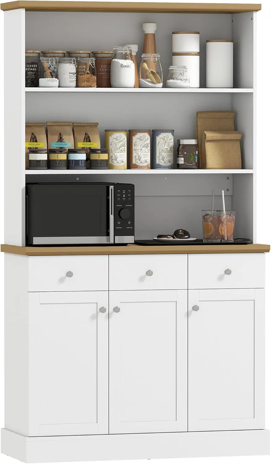 ARREDO FUNZIONALE: Questa credenza moderna può essere posizionata sia in cucina che nella sala da pranzo grazie al suo design neutro. SPAZIO FUNZIONALE: Dotata di 3 ripiani aperti, 3 cassetti e 2 armadietti, offre spazio per organizzare piatti, posate e tovaglie. PIANO D'APPOGGIO PRATICO: Ideale per posizionare elettrodomestici come microonde, macchina da caffè o tostapane. STRUTTURA SOLIDA: Realizzata in pannelli di truciolato, offre stabilità e può essere fissata alla parete per maggiore sicurezza. DIMENSIONE: Dimensioni generali: 101L x 39P x 180.5A cm. Montaggio richiesto.