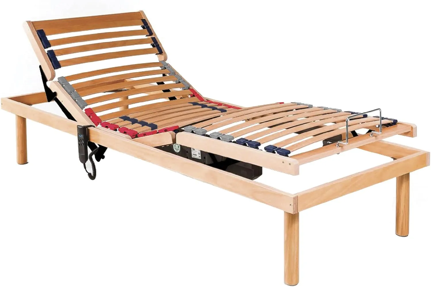Rete ortopedica con alzata elettrica motorizzata e doppio motore OKIN, telaio in legno di faggio naturale.