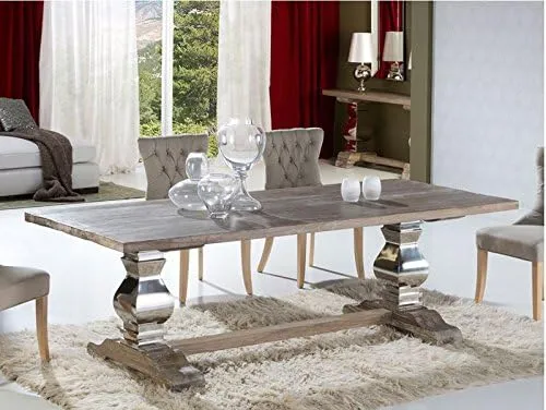 Tavolo in legno di olmo con finitura bianca. Pilastri in acciaio spazzolato. Piano con spessore di 4,5 cm.
